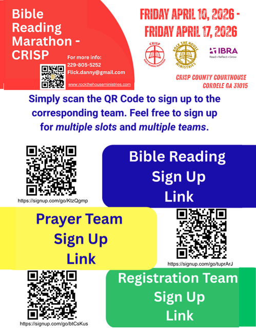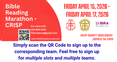Rock the House Ministries, Inc. in cooperation with The International Bible Reading Association is hosting the First-Ever Complete Public Bible Reading Marathon at the Crisp County Courthouse on April 10, 2026 through Friday, April 17, 2026.